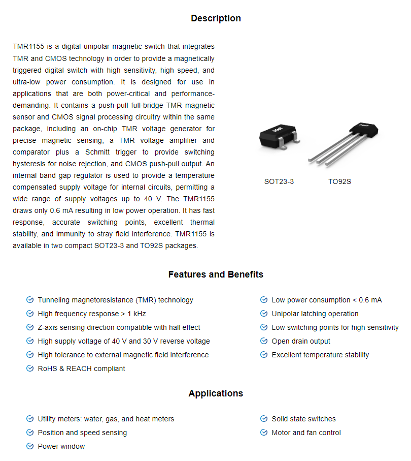 Type:UnipolarSupply voltage:3 V~40 VPower consumption:0.6 mAOperating mode:Continuous power supplySensitive direction:Z-axisB_op (Gs,25°C):70B_rp (Gs,25°C):55Output interface:Open DrainEncapsulation form:SOT23-3 TO92S