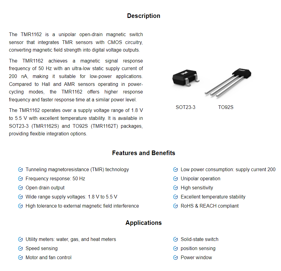 Type:UnipolarSupply voltage:1.8 V~5.5 VPower consumption:200 nAOperating mode:Time-of-use power supplySensitive direction:X-axisB_op (Gs,25°C):17B_rp (Gs,25°C):13Output interface:Open DrainEncapsulation form:SOT23-3 TO92S